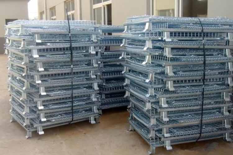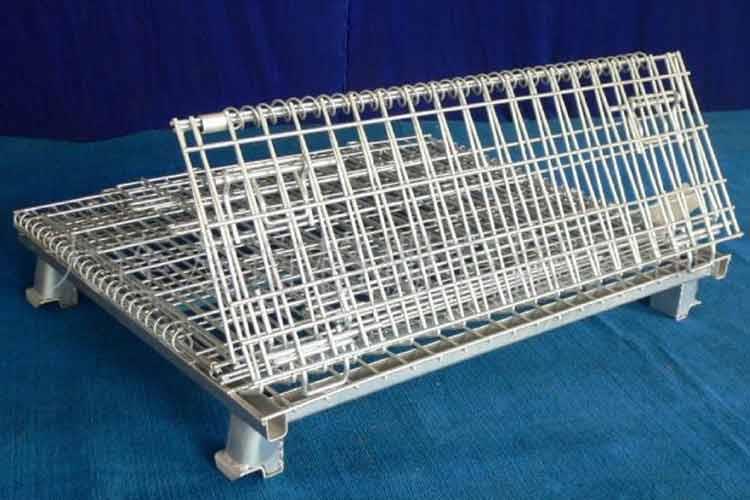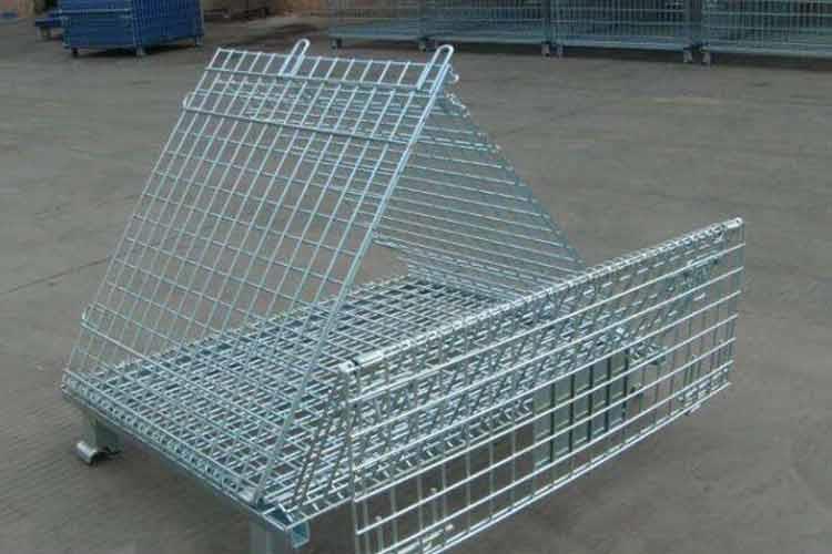 可折叠蝴蝶笼的主要原材料是高线拉成的钢丝,一般丝径是5mm,6mm,6.4mm。网片焊接的网目间距一般为50×100,100×100,50×50。折叠式仓库笼采用U型钢焊接而成,U型钢是冷轧带钢轧机轧制而成,底部四角采用冲压件一次冲制而成。